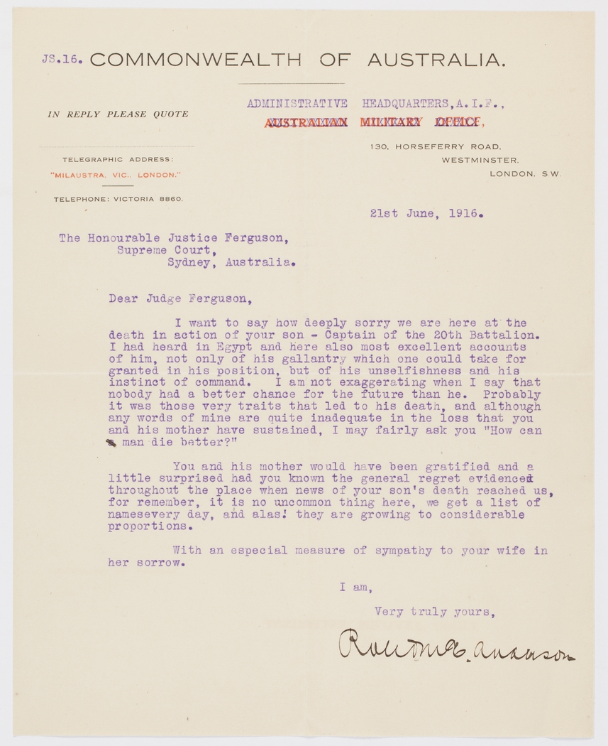 I want to say how deeply sorry we are here at the death in action of your son – Captain of the 20th Battalion. I had heard in Egypt and here also most excellent accounts of him, not only of his gallantry which one could take for granted in his position, but of his unselfishness and his instinct of command. I am not exaggerating when I say that nobody had a better chance for the future than he. Probably it was those very traits that led to his death, and although any words of mine are quite inadequate in the loss that you and his mother have sustained, I may fairly ask you "How can man die better?"