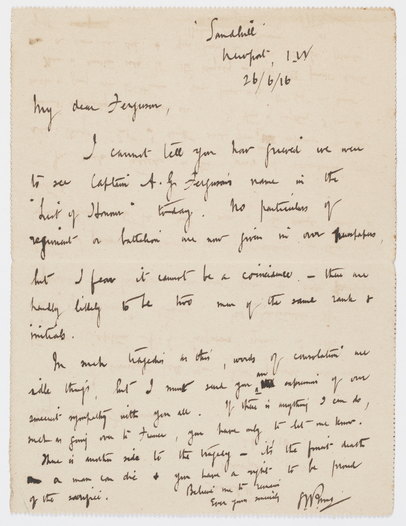 I cannot tell you how grieved we were to see Captain A. G. Ferguson's name in the "List of Honour" today. No particulars of regiment or battalion are now given in our newspapers, but I fear it cannot be a coincidence – that are likely to be two men of the same rank & initials.