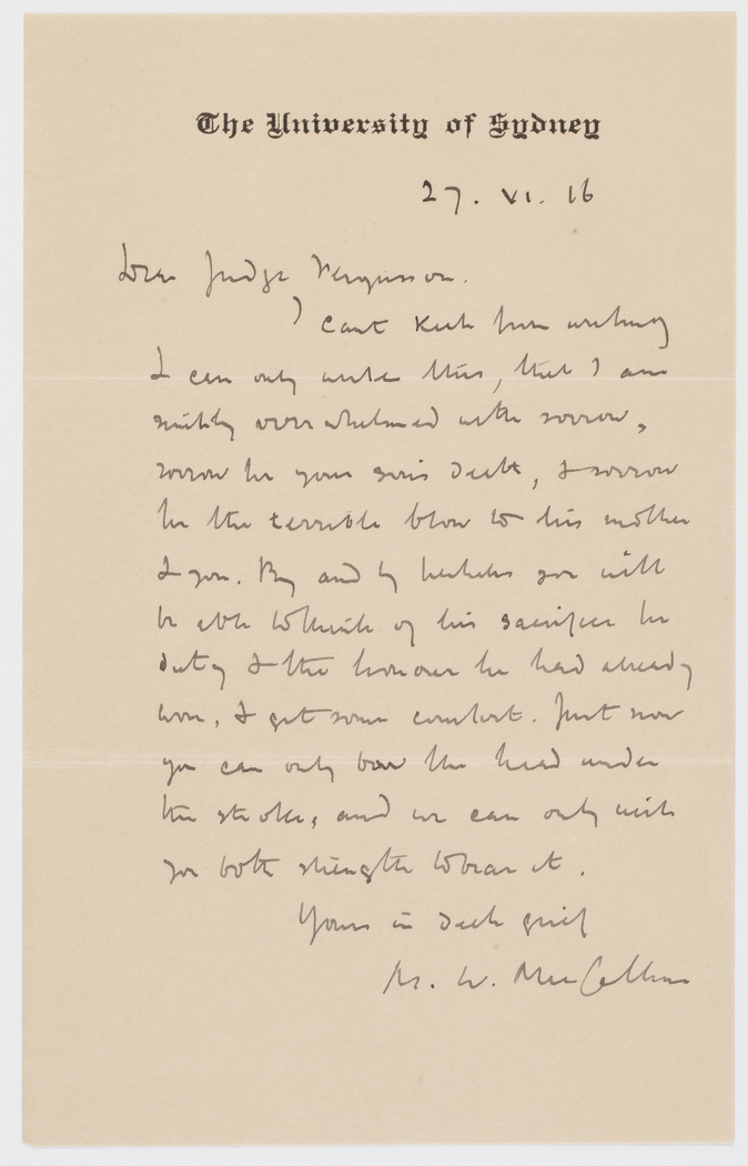 [Letter from Mungo William MacCallum, Dean of Faculty of Arts. Father of Major Walter Paton MacCallum]
