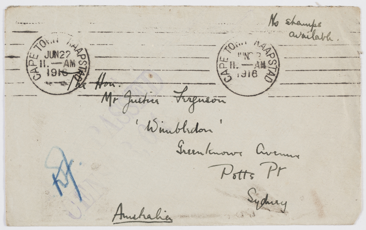 [Envelope post marked Cape Town Kaapstad, 22 June, 1916]No stamps available