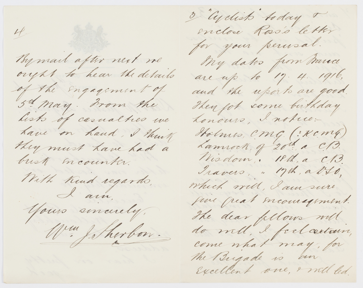 which will, I am sure give great encouragement. The dear fellows will do well, I feel certain, come what may, for the Brigade is an excellent one, & well led. By mail after next we ought to hear details of the engagement of 5th May. From the lists of casualties we have on hand, I think they must they had a brisk encounter.
