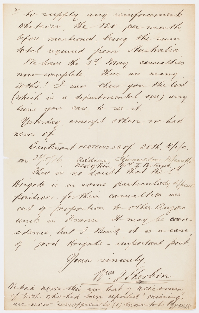 to supply any reinforcements whatever, the 120 per month, before mentioned, being the sum total required from Australia. We have the 5th May casualties now complete. There are many 20th's I can shew you the list (which is a departmental one) any time you care to see it.