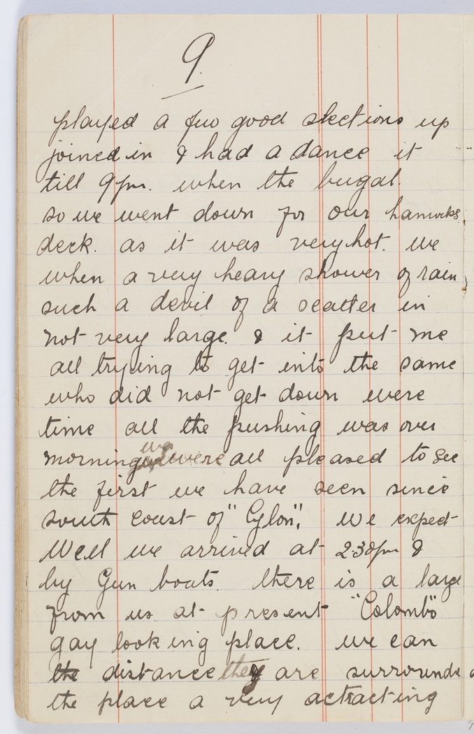 played a few good selections up on deck, & after that a lot of us joined in & had a dance it was very good we kept it up till 9 pm when the bugal sounded for lights to go out so we went down for our hammocks & brought them up to sleep on deck as it was very hot. We had just got nicely settled when a very heavy shower of rain came on, you never saw such a devil of a scatter in all your life as the hatch is not very large & it put me in mind of about 50 rabbits all trying to get into the same hole at once. Anyhow those who did not get down were shoved or pushed down & by the time all the pushing was over the rain had stopped. Well this morning we were all pleased to see a bit of land once more, us the first we have seen since we left Australia. It is the south coast of "Ceylon". We expect to reach "Colombo" about midday. Well we arrived at 2.30 pm & anchored & were well protected by Gun boats. There is a large Russian Cruiser not very far from us at present. "Colombo" from the distance is a very gay looking place. We can see the principal Hotels in the distance they are surrounded by Lawns & trees which gives the place a very actracting apperance.