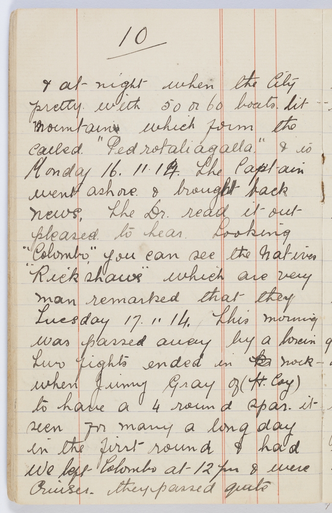 Monday 16.11.14. The Captain & some of the ships officers went ashore & brought back the papers with the latest war news. The Dr. read it out to us all which we were very pleased to hear. Looking with a pair of glasses at "Colombo" you can see the natives running along the roads pulling "Rickshaws" which are very comical things to look at one man remarked that they looked like big Turkey's.