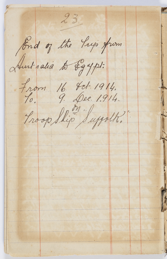 We left Mena Camp at 5 pm yesterday & marched into "Cairo" arrived at 9.30pm. on No.1 Centeral Railway we left at 12 Am & arrived at "Alexandria" at 5.30am & Embarked on the "Derfflinger" A 10. which was captured by the British The trip from Cairo to Alexandria was not a pleasant one, as we were crowded into 3rd class carrages & did not have any room to even move our legs & little alone get any sleep. at about 2pm we were on board the 2nd& 3rd Battalions about 2,500 all told.