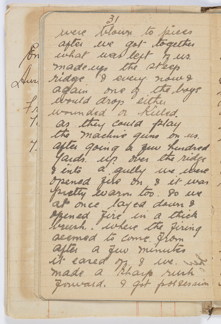 were blown to pieces after we got together what was left of us. made up the steep ridge & every now & again one of the boys would drop either wounded or killed. as they could play the machine guns on us. After going a few hundred yards up over the ridge & into a gully we were opened fire on & it was pretty warm too. So we at once layed down & opened fire in a thick brush where the firing seemed to come from After a few minutes it eased off & we made a sharp rush forward & got possession of it I came across a Turk laying wounded with his rifile laying beside him so I grabbed his rifle & broke the stock off it so as he could do no harm with it. After we got through the thick brush we had to climb a very steep cliff so we helped one another up. when we got to the top we were met again with heavy rifle fire but we charged over the ridge & got possession of it & facing us we could see the Turks in trenches ahead of us. here we kept under cover & took off our heavy packs as we