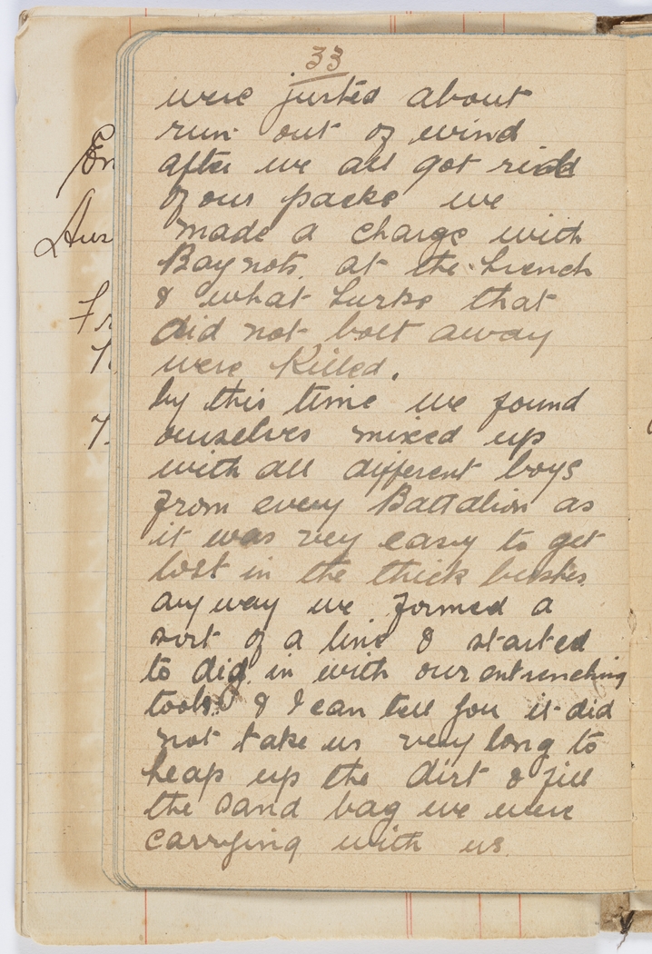 were justed about run out of wind After we all got rid of our packs we made a charge with Baynots at the trench & what Turks that did not bolt away were killed. by this time we found ourselves mixed up with all different boys from every Battalion as it was very easy to get lost in the thick bushes any way we formed a sort of a line & started to dig in with our entrenching tools & I can tell you it did not take us very long to heap up the dirt & fill the sand bag we were carrying with us by this time the Turks had found out where we were & they started to attack us but we kept them back with rifle fire any way they made it pretty warm for us as we were laying flat on the ground & you could not lift your head as the machine g machine gun bullets were plowing up the dirt in front of us & they started to shell us which made things a thousands times worse I thought my end had come many a time as men were falling all around me & some of my best mates were