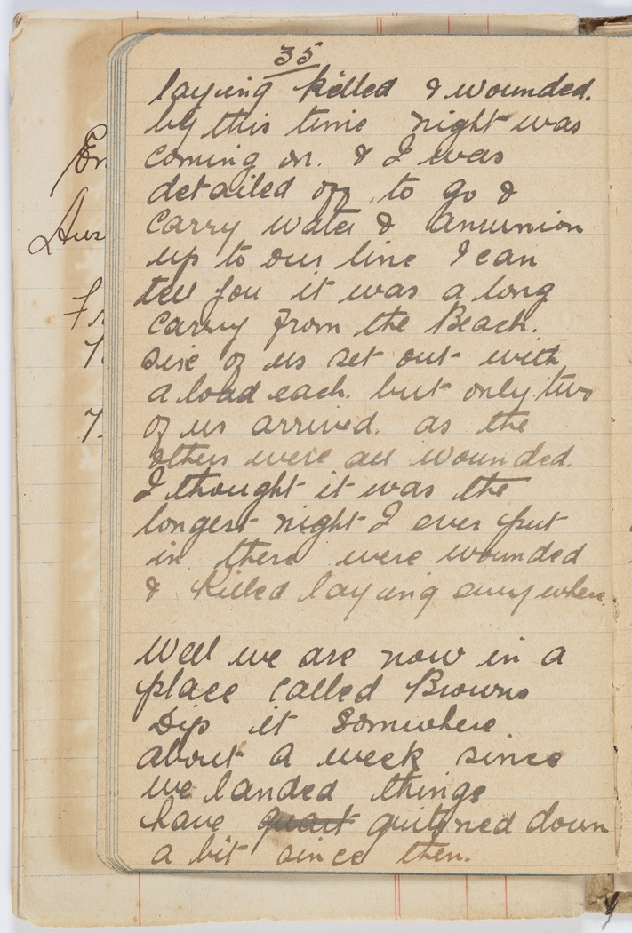Well we are now in a place called Browns Dip it somewhere about a week since we landed things have quait quitened down a bit since then. Diary writing has been out of the question as any spare moments one was very glad to get a little sleep. We have got fairly good trenches dug & we are all busy making ourselves dug outs. During the last week I have been detailed off as a stretcher bearer to my Coy. B Company. as all the old bearers have been killed or wounded. I might say I lost my tobacco in the landing & I havent had a smoke for over a week what would I give for one. any thing. but again I would give more for some steak & onions