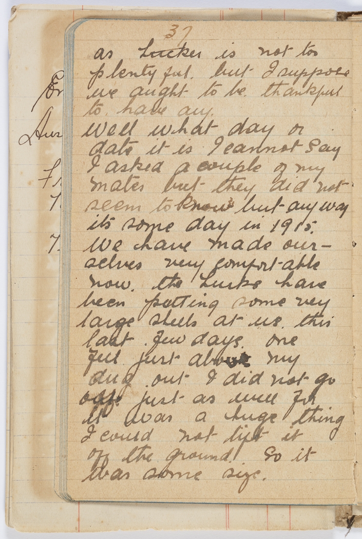 Well what day or date it is I cannot say I asked a couple of my mates but they did not seem to know but any way its some day in 1915. We have made ourselves very comfortable now. the Turks have been putting some very large shells at us this last few days one fell just above my dug out & did not go off just as well for it was a huge thing I could not lift it off the ground. so it was some size.