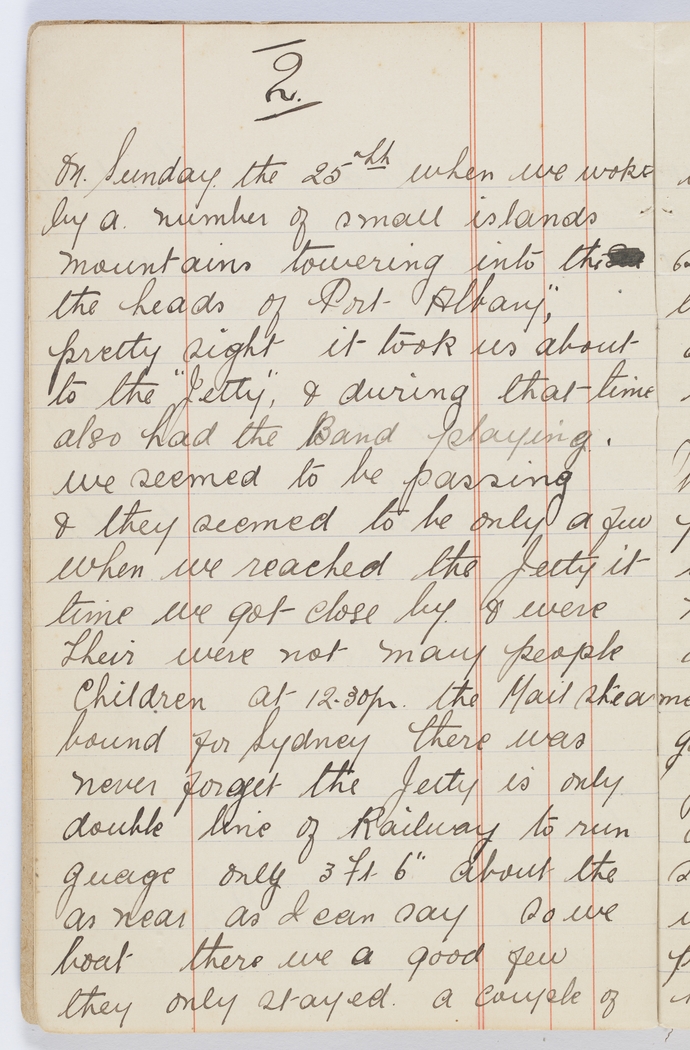 On Sunday the 25th when we woke we found ourselves surrounded by a number of small islands which were like small mountains towering into the sky. an hour later we reached the heads of Port Albany," Western Australia. It was a very pretty sight it took us about an hour to go from the heads up to the "Jetty", and during that time we had church service, we also had the Band playing. Just before we reached the Jetty we seemed to be passing between two high walls of rocks & they seemed to be only a few yards away from the boat. When we reached the Jetty it was about 11.Am. & by the time we got close by & were made fast it was 12 pm. Their were not many people on the Wharf only a few children at 12.30pm the Mail steamer arrived from "Fremantle," bound for Sydney there was great cheering which I will never forget the Jetty is only just room enough for a double line of Railway to run along it is very small gauge guage only 3Ft 6" about the same as Queensland railways. as near as I can say so we were quite close to the Mail boat there we a good few passengers, a rough guess 350 they only stayed a couple of hours to pick up & drop the Mails.