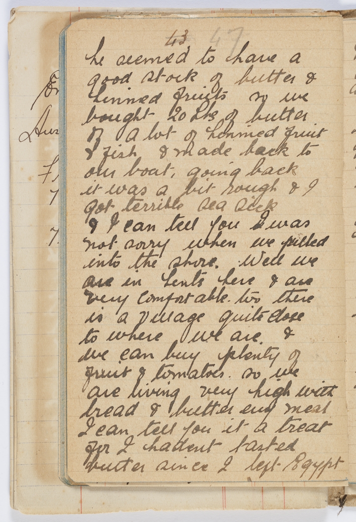 he seemed to have a good stock of butter & Tinned fruits so we bought 20 Lbs of butter of a lot of Tinned fruit & fish & made back to our boat, going back it was a bit rough & I got terrible sea sick & I can tell you I was not sorry when we pulled into the shore. Well we are in Tents here & are very comfortable too there is a village quite close to where we are & we can buy plenty of fruit & tomatoes so we are living very high with bread & butter evry meal I can tell you it a treat for I hadent tasted butter since I left Egypt. Our old Dr. was sent away yesterday sick so today we received a new one. Major McDonald. We are having a very good time. nothing to do. only our sick perade every morning.