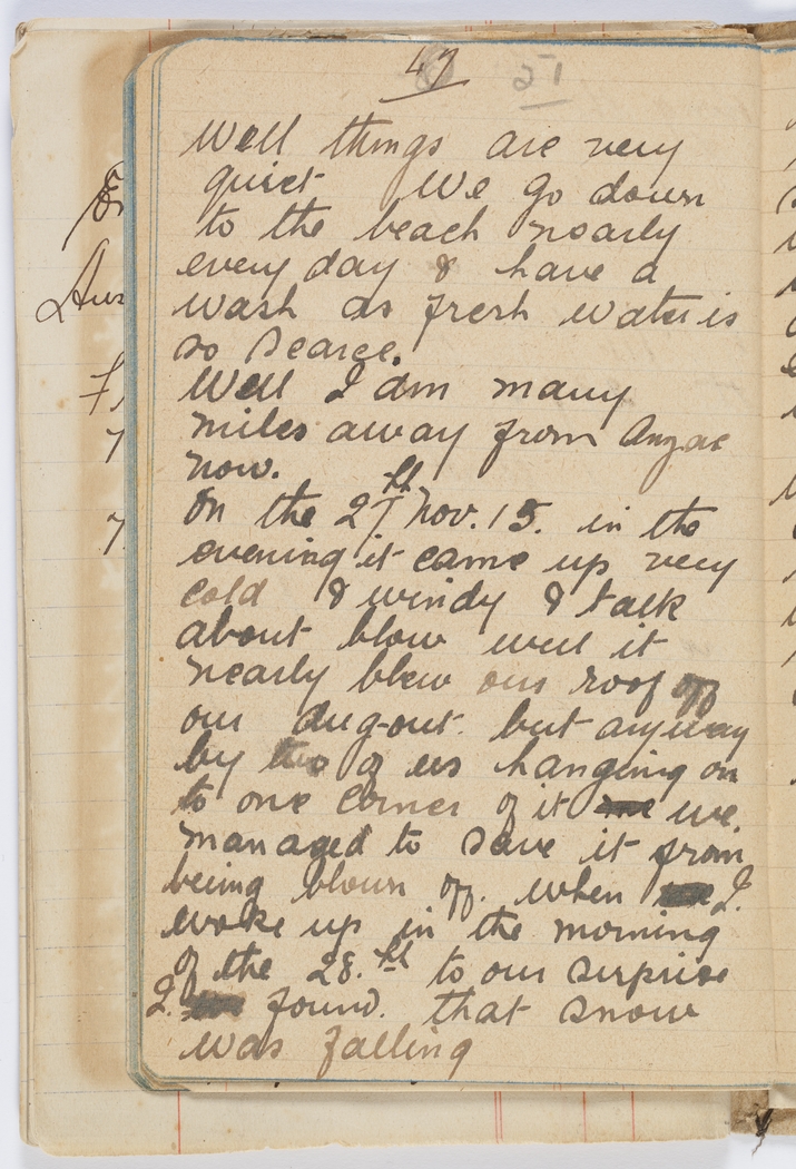 On the 27th Nov. 15 in the evening it came up very cold & windy & talk about blow well it nearly blew our roof off our dug-out but anyway by two of us hanging on to one corner of it we we managed to save it from being blown off. when we I woke up in the morning of the 28th to our surprise I we found that snow was falling the first time in my life that I had ever seen snow. of course we had some fun snow balling one another. about 4 pm in the evening I got a fit of the cold shivers & could not get warm. things were very quiet & as I could not hold my head up I layed down in the dug out & tryed tried to go to sleep but I was so cold my mates gave me their over coats & put them over me but I was still cold & my head was nearly bursting I had in the morning I felt terrible bad & about 2 pm on the 29 Nov. they put me on a stretcher & carried me down to the