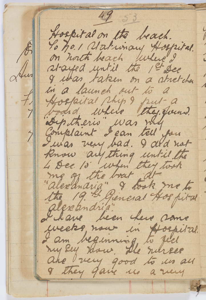 Hospital on the beach. To No.1 stationary Hospital. on North beach where I stayed until the 1st Dec & was taken on a stretcher in a launch out to a Hospital ship & put a board where they found "Diptheris" was my complaint I can tell you I was very bad & did not know anything until the 4 Dec. 15 when they took me off the boat at "Alexandria" & took me to the 19th General Hospital "Alexandria".