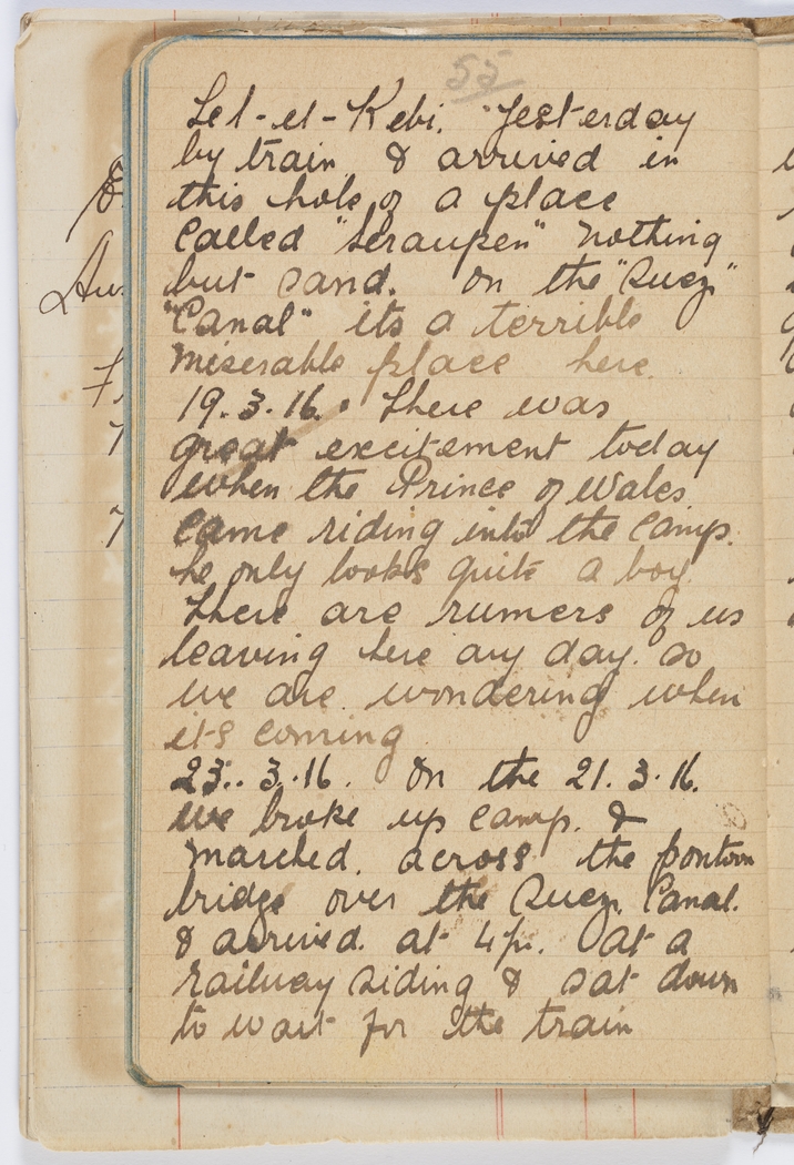 19.3.16 There was great excitement today when the Prince of Wales came riding into the camp. he only looks quite a boy. There are rumers of us leaving here any day so we are wondering when its coming.