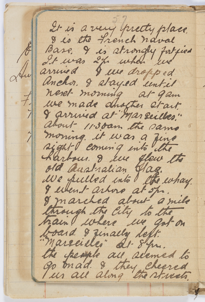 It is a very pretty place & is the French Naval Base & is strongly fortified. It was 2 pm when we arrived & we dropped anchor & stayed until next morning at 9 am we made another start & arrived at "Marseilles." about 11.30 am the same morning. it was a fine sight coming into the harbour & we flew the old Australian flag. We pulled into the wharf & went ashore at 5 pm & marched about a mile through the city to the train where we got on board & finally left "Marseilles" at 8 p.m. the people all seemed to go mad & they cheered us all along the streets. We seen scored of German prisioners working along along the streets at different places. cleaning out the gutters. We were all night in the train & were pretty well cramed in. we had a bit of a sleep We were all very pleased when it broke day-light to see what the country was like everybody seemed to be very happy our first place to call at was "Orange" our next place was Lyons where we stayed & had breakfast & its a very fine place. of Other We passed through some very large towns & went over some beautiful rivers & bridges