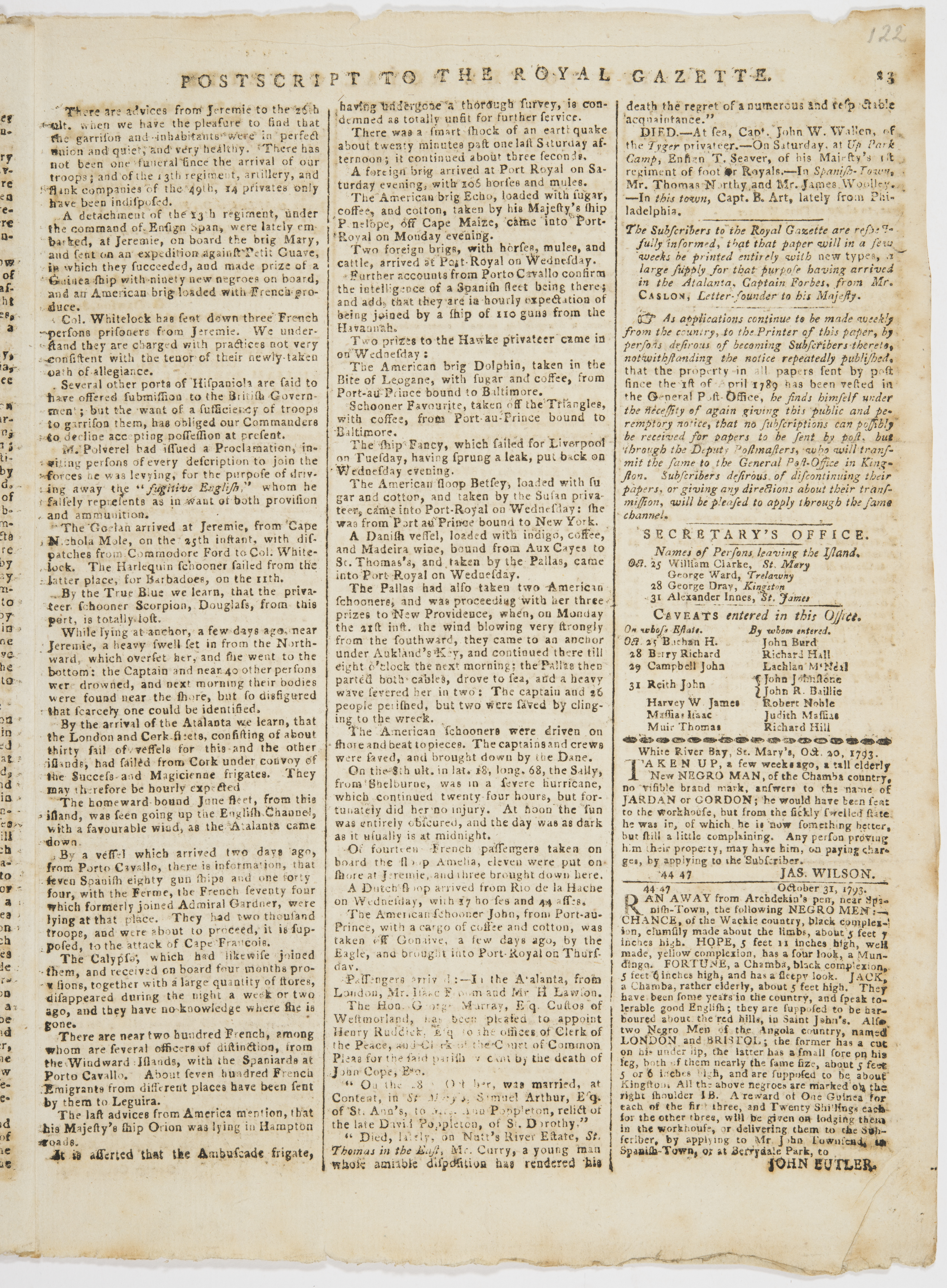 Col. Whitelock has sent down three French persons prisoners from Jeremie. We understand they are charged with practices not very consistent with the tenor of their newly-taken oath of allegiance.