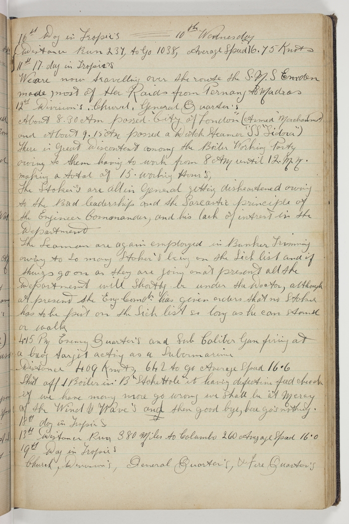 Divisions, Church, General Quarter's. About 8.30 AM. passed "City of London" (Armed Merchantman) and about 9.15 AM. passed a Dutch steamer "S.S. Sidora". There is Great Discontent among the Boiler working Party owing to them having to work from 8 AM to 12 M.N. making a total of 15 working Hour's. The Stoker's are all in General getting disheartened owing to the Bad leadership and the Sarcastic principles of the Engineer Commander, and his lack of interest in the Department. The Seamen are again employed in Bunker Trimming owing to so many Stoker's being on the Sick List and if things go on as they are going on at present all the Department will shortly be under the Doctor, although at present the Eng. Comdr. has given order that no Stoker has to be put on the Sick list as long as he can stand or walk. 4.15 PM, Enemy Quarter's and Sub Caliber Gun firing at a buoy target acting as a Submarine. Distance 409 Knots, 642 to go, average Speed 16.6. Shut off 1 Boiler in B "Stokehole" it having defective feed check, if we have many more going wrong we shall be at Mercy of Wind & Wave's and then good bye, here go's nothing. 18th day in Tropic's.