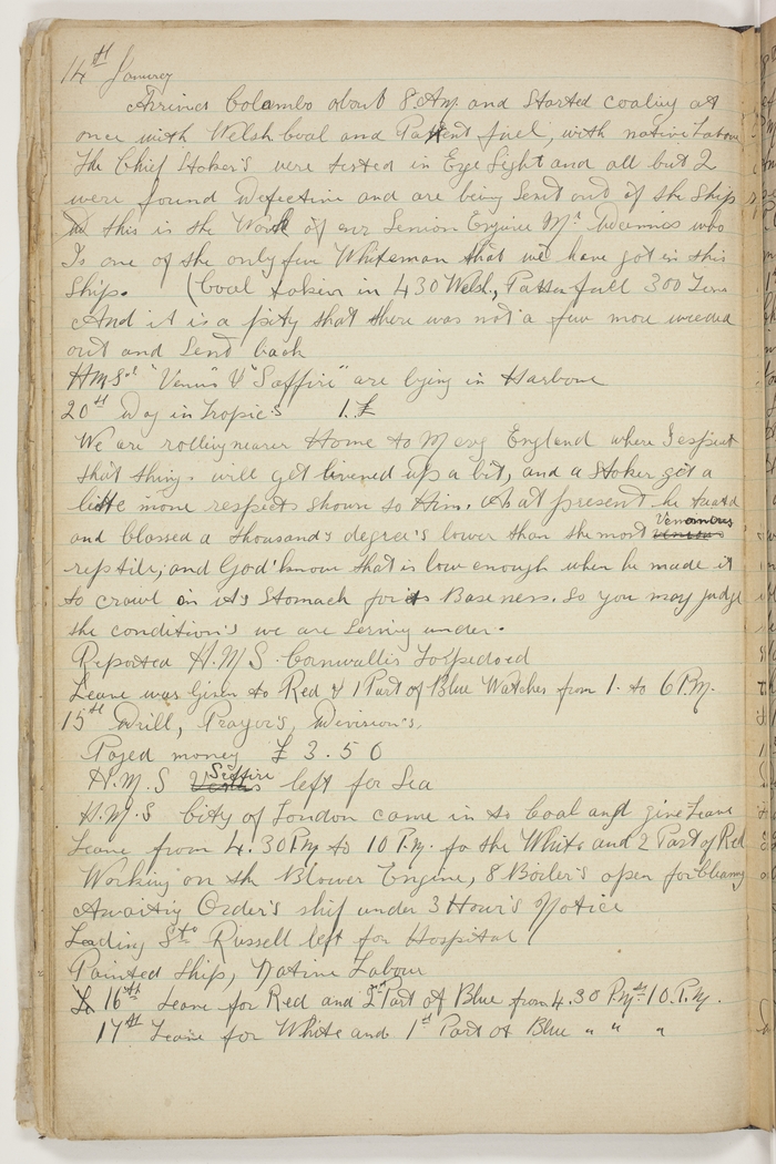 Arrived Colombo about 8 AM and started coaling at once with Welsh Coal and Patten fuel, with native labour. The Chief Stoker's were tested in Eye Sight and all but 2 were found Defective and are being sent out of the Ship. This is the Work of our Senior Engineer Mr. Dennis who is one of the only five Whiteman that we have got in this Ship. (Coal taken in 430 Welsh, Patten fuel 300 Tons.) And it is a pity that there were not a few more weeded out and sent back. H.M. Sub. "Venus" & "Saffire" [Sapphire] are lying in Harbour. 20th Day in Tropic's 1£. We are rolling nearer Home to Merry England where I expect that things will get livened up a bit, and a Stoker get a little more respects shown to Him. As at present he treated and Classed a thousand degree's lower than the most venomous reptile, and God knows that is low enough when he made it to crawl on its Stomach for its Baseness. So you may judge the condition's we are Serving under. Reported H.M.S. Cornwallis Torpedoed. Leave was given to Red & 1 Part of Blue Watches from 1 to 6 PM.