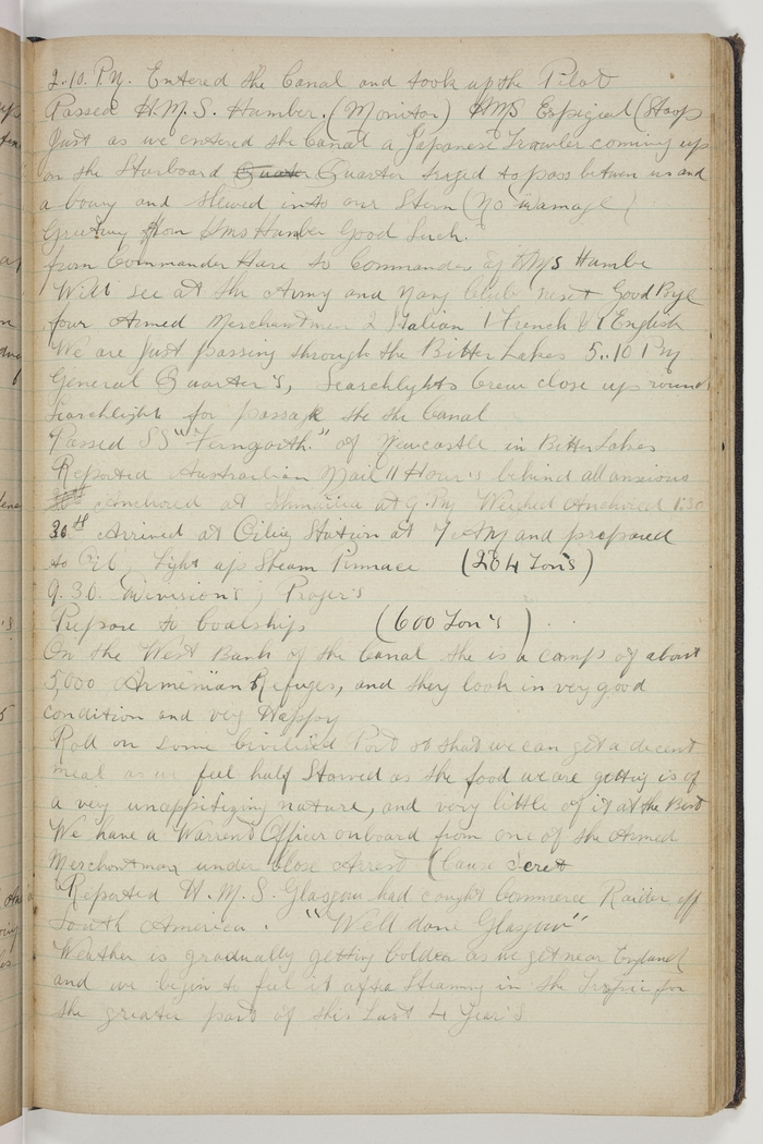 2.10 PM. Entered the Canal and took up the Pilot. Passed H.M.S. Humber (Monitor), H.M.S. Espigeal [Espiegle] (Sloop). Just as we entered the Canal a Japanese Trawler coming up on the Starboard Quarter Quarter tryed to pass between us and a bouy and slewed into our Stern (No Damage). Greeting from H.M.S. Humber, "Good Luck", from Commander Hare to Commander of HMS Humber. "Will see at the Army and Navy Club next. Good Bye". Four Armed Merchantmen 2 Italian 1 French & 1 English. We are just passing through the Bitter Lakes 5.10 PM. General Quarters, Searchlights Crew close up round Searchlight for passage the [through] the Canal. Passed SS "Ferngarth" of Newcastle in Bitter Lakes. Reported Austrailian Mail 11 Hours behind, all anxious. Anchored at Ishmailia at 9 PM. Weighed Anchor at 1.30.