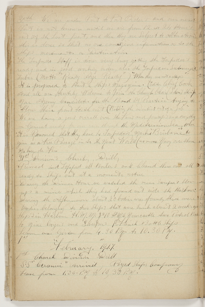 We are under Port to Port Orders and our next Port is not known until we are from 12 to 24 Hour's out of the Last Port, and then they are subject to alteration's, this is done so that no one cannot give information as to the Ship's movements or Destination. The Torpedo Staff is now very busy getting the Torpedoes ready and in good working order also the Torpedoes Submerge's Tubes (Motto "Ready Aye Ready"). "When they are not asleep". It is proposed to start a Ship's Magazine (Editor Chief Cook) and all are Heartily Welcome to join the Church Choir (I don't think). More Agony, Candidates for the Band at Practice trying to blow their front Teeth out ("Robbing the Dentist out of a job"). We are having a good overall over the Fans and pumps and everything in General heading for our run through the Mediterranean Sea, where it is Rumoured that they have 4 Torpedoes marked Brisbane to give us a Free Passage into the Next World (no more Navy over there). Makee de Fin.