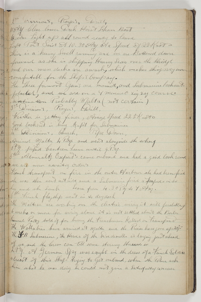 French flagship went in to dry dock. The Maltese are working on the electric wiring it will probably 6 weeks or more for wiring alone, it is not settled about the Boiler. Funeral Party told of for buring the Frenchman Killed on Transport. The Wallabies have arrived at Malta and the Prices have gone up 20%. The F11 Submarine, the Heroes of the Dardenells [Dardanelles] is laying just ahead of us and the Crew can tell some stirring Stories. 2 PM A German Spy was caught in the dress of a French Soldier abreast of this Ship trying to get onboard, when the Police ask him what he was doing he could not give a satisfactory answer.