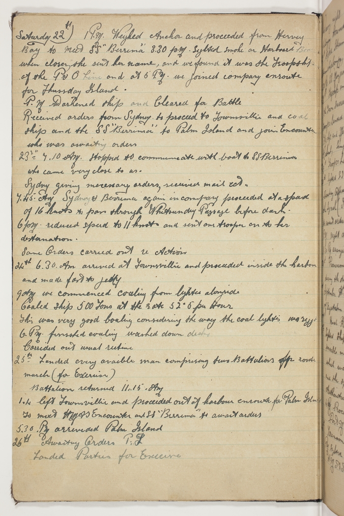 1 P.M. Weighed Anchor and proceeded from Hervey Bay to meet SS "Berrima". 3.30 pm. Sighted smoke on Starboard Beam and when closer, she sent her name, and we found it was the Troopship of the P&O line and at 6 P.M. we joined company enroute for Thursday Island. P.M. Darkened ship and Cleared for Battle. Received orders from Sydney to proceed to Townsville and coal ship and the SS "Berrima" to Palm Island and join Encounter who was awaiting orders.