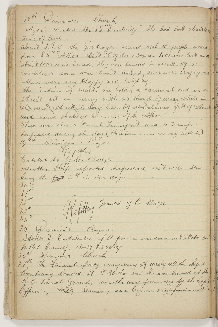 Divisions, Church. Again visited the S.S. "Trowbridge". She had lost about 400 Tons of Coal. About 2 PM. the Destoyer's arrived with the people rescued from S.S. "Athos" about 15 Miles outside, 400 were lost and about 1000 were saved, they were landed in alsorts of conditions, some were almost naked, some were crying and others were very Happy and laughing. The natives of Malta are holding a carnival and in one street all is merry with no though [thought] of war, while in the next street is long lines of Ambulances full of Wounded and nerve shattered survivors of the Athos. There was also a French Transport and a Tramp torpedoed during the day. (The Submarines are very active.)