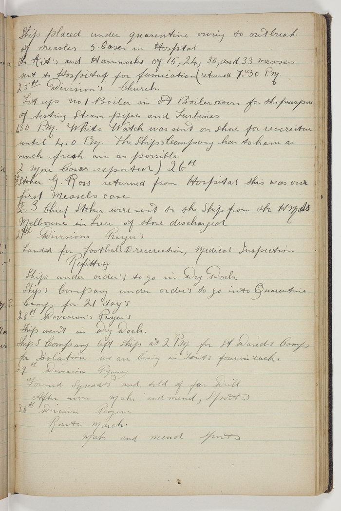 Divisions, Prayer's. Landed for football & reccreation, Medical Inspection. Refitting. Ship under orders to go in Dry Dock. Ship's Company under orders to go into Quarentine Camp for 21 day's.