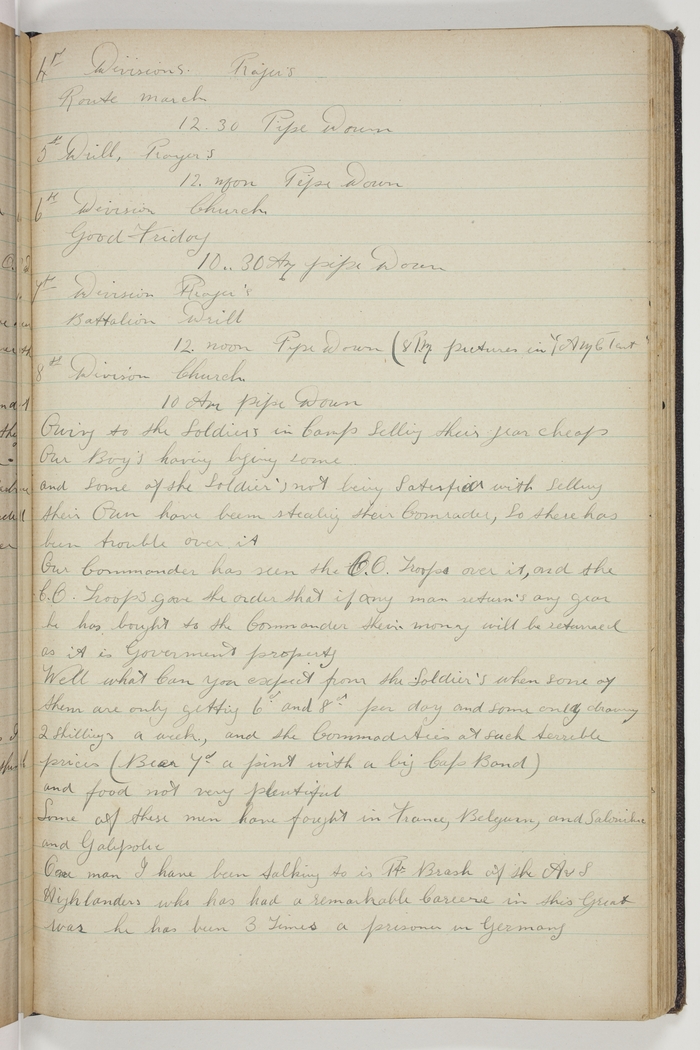 Divisions. Church. 10 AM Pipe Down. Owing to the Soldiers in Camp selling their gear cheap, Our Boy's having buying some and some of the Soldier's not being satisfied with selling their Own, have been stealing their Comrades, so there has been trouble over it. Our Commander has seen the C.O. Troops over it, and the C.O. Troops gave the order that if any man returns any gear he has bought to the Commander their money will be returned as it is Government property. Well what can you expect from the Soldier's when some of them are only getting 6d. and 8d. per day and some only drawing 2 Shillings a week, and the Commodities at such terrible prices (Beer 7d. a pint with a big Cap Band) and food not very plentiful. Some of these men have fought in France, Belgium, and Salonika and Galipoli [Gallipoli]. One man I have been talking to is Pte. Brash of the A & S [Argyll & Sutherland] Highlanders who has had a remarkable Career in this Great War, he has been 3 Times a prisoner in Germany