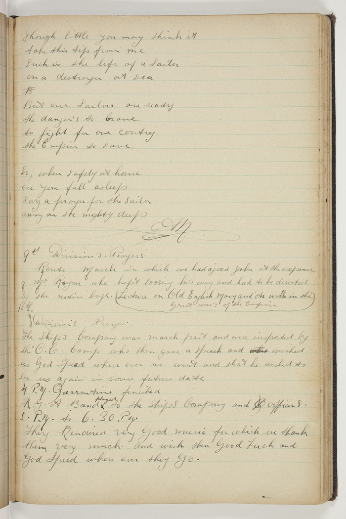 Divisions, Prayer's. Route March in which we had a good joke at the expense of Mr. Ryan who kept loosing his way and had to be directed by the native boys. (Lecture on Old English Navy and its work in the Great wars of the Empire.)