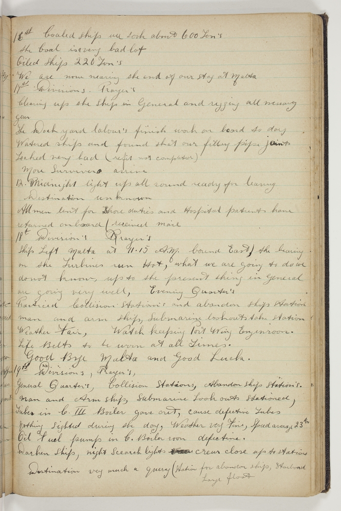 Divisions, Prayers. Ship left Malta at 11.15 AM. bound East. The bearing on the Turbines run Hot, what we are going to do we do not know, up to the present things in General are going very well. Evening Quarter's. Practiced Collision Stations and abandon Ship Stations, man and arm Ship, Submarine lookouts take station. Weather Fair, Watch keeping Port Wing Enginroom. Life Belts to be worn at all times. Good Bye Malta and Good Luck.