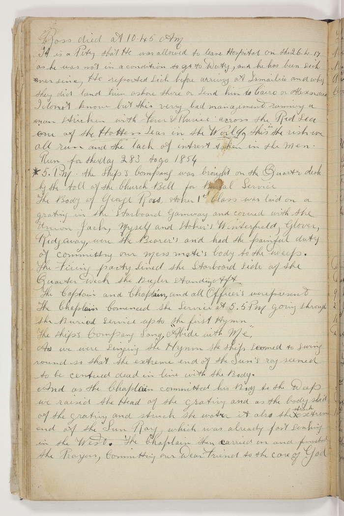 5 PM. The Ship's Company was brought on the Quarter deck by the toll of the Church Bell for Burial Service. The Body of George Ross, Stoker 1st. Class, was laid on a grating in the Starboard Ganway and covered with a Union Jack. Myself and Stoker's Winterfield, Glover, Ridgeway, were the Bearer's and had the painful duty of committing our Mess mate's body to the Deep. The Firing party lined the Starboard side of the Quarter Deck, the Bugler standing Aft. The Captain and Chaplain, and all Officer's were present. The Chaplain commenced the Service at 5.5.PM. going through the Burial Service up to the first Hymn. The Ship's Company sang "Abide with Me". As we were singing the Hymn the Ship seemed to swing round so that the extreme end of the Sun's ray seemed to be centred dead in line with the Body. And as the Chaplain committed his Body to the Deep we raised the Head of the Grating and as the body slid of the Grating and struck the water it also struck the extreme end of the Sun Ray, which was already fast sinking in the West. The Chaplain then carried on and finished the Prayer, Committing our dear Friend to the care of God.