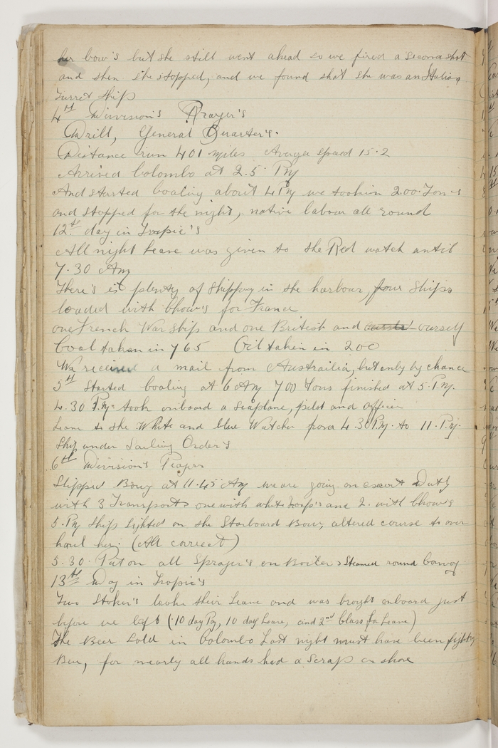 Divisions, Prayer's. Drill, General Quarter's. Distance run 401 miles, average Speed 15.2. Arrived Colombo 2.5 PM and started Coaling about 4PM, we took in 200 Tons and stopped for the night, native labour all round. 12th day in Tropic's. All night leave was given to the Red watch until 7.30 AM. There is plenty of shipping in the harbour, four Ships loaded with Chows for France. One French Warship and one British and austral ourself. Coal taken in 765, Oil taken in 200. We received a mail from Austrailia, but only by chance.