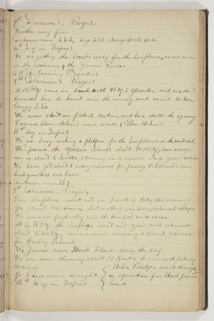 Divisions, Prayer's. Our Seaplane went out on Scouting duty this morning for about one Hour but nothing was seen, returned all safe. We are not patrolling over the Hundred mile eara [area]. At 4.15 PM the Seaplane went out again and returned about 5.40 PM., we are now running a direct course for Keeling Island. We passed some Small Islands during the day. We are now steaming about 16 Knots to our next patrolling Station. No Press news to night. 16th Day in Tropic's. Stoker Bridger went through an operation for blood poisoned hand.