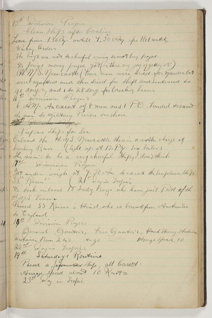 Divisions, Prayer'. s Clean Ship after Coaling. Leave from 1.30 PM until 7.30 AM for Red watch. Waiting Orders. The boys are not so cheerful owing to not being payed. No prize money payed yet (is there any joy of getting it). H.M.S. Newcastle (Four men were tried for Murder but were aquitted and then tried for theft and sentenced to 90 days, and 1 to 28 days for breaking Leave.)