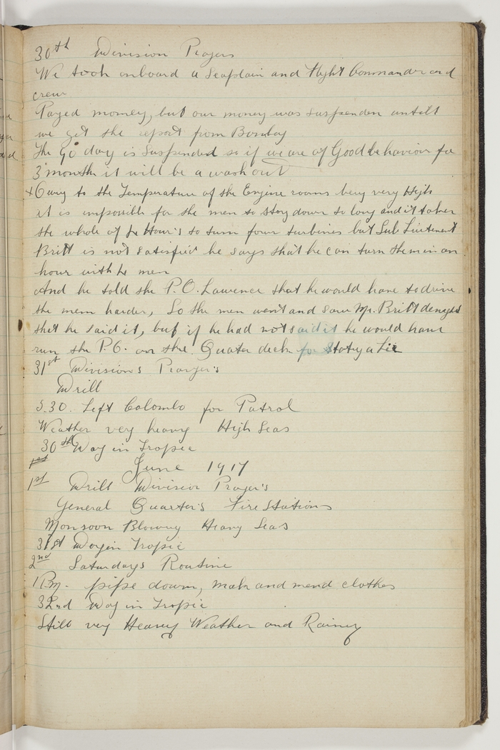 Divisions, Prayer's. Drill. 5.30 Left Colombo for Patrol. Weather very heavy High seas. 30th Day in Tropic