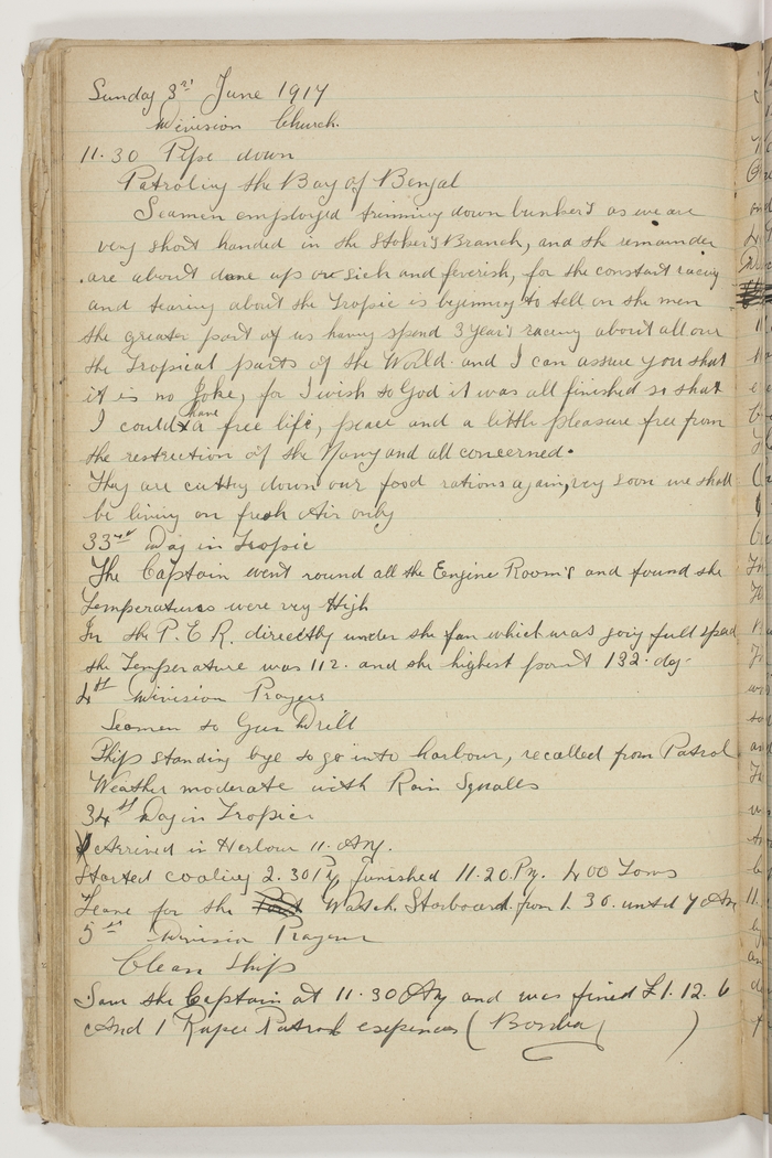 Division, Church. 11.30 Pipe down. Patroling the Bay of Bengal. Seamen employed trimming down bunkers as we are very short handed in the Stoker's Branch, and the remainder are about done up or sick and feverish, for the constant racing and tearing about the Tropic is beginning to tell on the men, the greater part of us having spend 3 Year's racing about all over the Tropical parts of the world and I can assure you that it is no Joke, for I wish to God it was all finished so that I could have a free life, peace and a little pleasure free from the restriction of the Navy and all concerned. They are cutting down our food rations again, very soon we shall be living on fresh Air only. 33rd Day in Tropic. The Captain went round all the Engine Room's and found he Temperatures were very High. In the P.E.R. directly under the fan which was going full speed the Temperature was 112 and the highest point 132 deg.