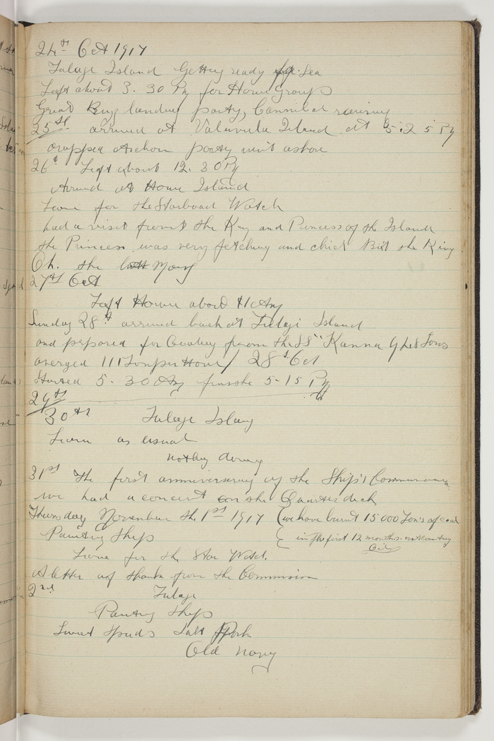 Left about 12.30 PM. Arrived at Howe Island. Leave for Starboard Watch. Had a visit from the King and Princess of the Islands, the Princess was very fetching and chick, But the King Oh, the [indecipherable] many.
