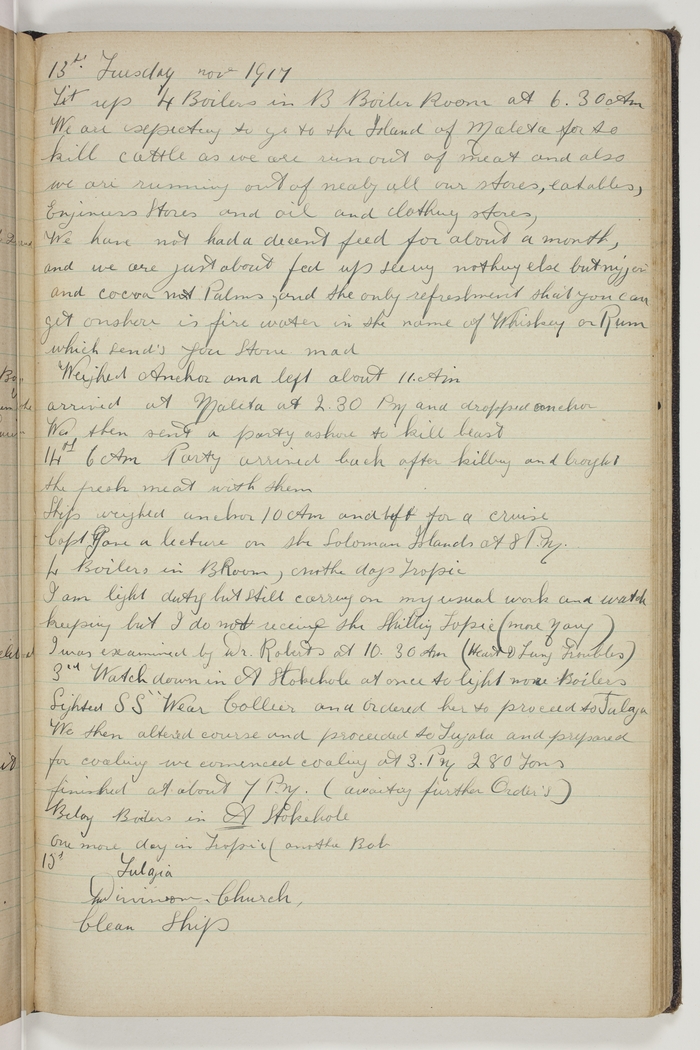 6 AM, Party arrived back after killing and brought the fresh meat with them. Ship weighed anchor 10 AM. and left for a cruise. Capt. gave a lecture on the Solomon Island at 8 PM. 4 Boilers in B Room, another days Tropic. I am light duty but still carrying on my usual work and watch keeping but I do not receive the shilling Tropic (more Navy). I was examined by Dr. Roberts at 10.30 AM (Heart & Lung Troubles). 3rd Watch down in Stokehole to light more Boilers. Sighted S.S. " Wear" Collier and ordered her to proceed to Tulaga [Tulagi]. We then altered course and proceeded to Tugala and prepared for coaling, we comenced coaling at 3 PM 280 Tons, finished at about 7 PM. (Awaiting further Orders.) Belay Boilers in A Stokehole. One more day in Tropic (another bob).