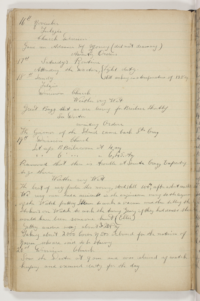 Division, Church. Lit up B Boiler room at 4 AM. Lit up C Boiler room at 6.45 AM. Rumoured that there is trouble at Santa Cruz, expecting to go there. Weather very Wet. The beat of my pulse this morning, stood still 100 deg. after a short walk. We very near had an accident in the engine room owing to the Engineer of the Watch putting Steam to work a vacum and then telling the Stoker's on Watch to work the turning gear, if they had done so there would have been someone hurt (Ellis). Getting under way about 3.20 PM. Taking about 2000 Cocoa Nuts on board for the natives of Narru [Nauru], who are said to be starving.