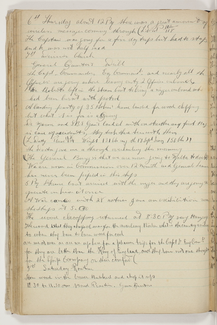 Division, Church. General Quarters, Drill. The Capt., Commander, Eng. Commandr. and nearly all the Officers are going ashore leaving only 2 Officers onboard. Dr. Roberts left in the Steam boat to bring a nigger onboard who had been burnt with petrol. A landing party of 35 Stokers have landed for wood chopping but what it is for is a Query. Dr. Marne and S.B.S. Gan's landed with one stretcher and first Bag in case of accidents, they took there teas with them. (L. Duty, Pulse 118/134 Weight 131 lbs. on the 17th Sept. I was 150 lbs.)! The Doctor gave me a through overhauling this morning. (The General Buzz is that we are now going to Malta to dock.) We are now in commission over 12 Month and General Leave has never been piped in this ship. 5 PM Steam boat arrived with the nigger and they are going to operate on him at once. A War canoe with 28 natives gave an exhibition round the Ship at 5.30. The wood chop party returned at 8.30 PM very Hungry. The wood that they choped was for the auxiliary Boiler, what is the country coming to when they have to burn wood for coal. Are we at war or are we up here for a pleasure trip for the Capt. & Eng. Comdr. for they are better than the King of England, and they have not one thought for the Ship Company or their comfort.