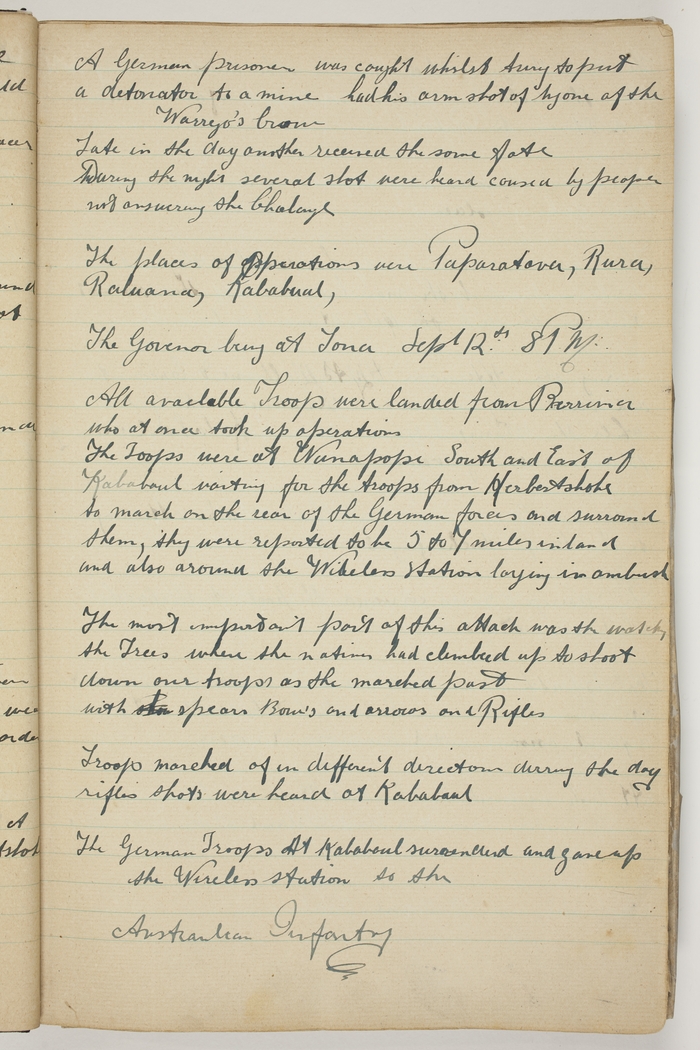 8 PM. All available Troops were landed from Berrima who at once took up operations. The Troops were at Nunapopi South and East of Kabakaul waiting for the troops from Herbertshohe to march on the rear of the German forces and surround them, they were reported to be 5 to 7 miles inland and also around the Wireless Station laying in ambush. The most important part of this attack was watching the Trees where the natives had climbed up to shoot down our troops as the [they] marched past with spears Bows and arrows and Rifles. Troops marched of in different directions during the day, rifles shots were heard at Kababaul. The German Troops at Kabakaul surrendered and gave up the Wireless Station to the Austrailian Infantry.
