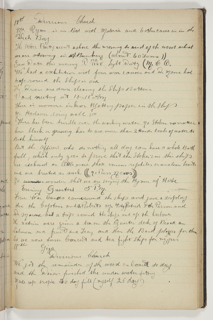 Mr. Ryan is in Bed with Maleria and 6 other cases is in the Sick Bay. The Wood Party went ashore this morning to send of the wood which we are stowing in A Bunkers, (about 60 Tons). Saw Doctor this morning P. 120R/136E Light Duty (M.C.O.). We had a exhibition with four war canoes and Dr. Marne had a trip round the Ship in one. The Divers are down clearing the Ship Bottom. Band meeting at 10.15 AM. There is no more ink or Blotting paper in the Ship. Mr. Hodson very well. T.100. There has been trouble over the washing water. No Stoker no matter how black or greasery has to use no more than 2 Hand bowls of water to Bath himself. But the Officer's who do nothing all day can have a whole Bath full, which only goes to prove that the Stoker's in the ship are reckoned as little more than venous reptiles or unclean beasts and are treated as such. (No Press News.) No wonder that we are singing the Hymn of Hate. Evening Quarters 5 PM. Four War Canoes came round the ship and gave a display then the Captain and Dr. Roberts, Mr. FitzPatrick & the Parson and Dr. Marne had a trip round the ship and up the harbour. The natives were given a tea on the Quarter deck of Bread and Salmon and fruit and Tea, and then the Band played for them. So we now turn Concert and tea fight ship for niggers.
