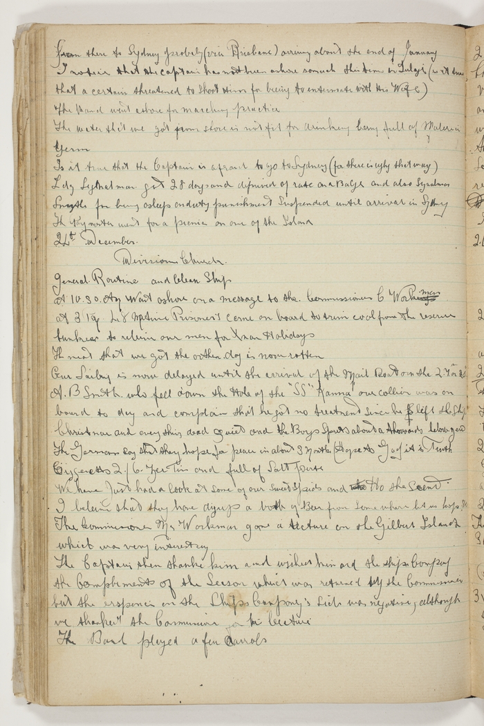 Divisions Church. General Routine and Clean Ship at 10.30 AM. Went ashore on a message to the Commissioner C. Workman. At 3.PM 48 Native Prisoner's came on board to trim coal from the reserve bunkers to relieve our men for Xmas Holidays. The meat that we got the other day is now rotten. Our Sailing is now delayed until the arrival of the Mail Boat on the 27th or 28th. A.B. Smith who fell down the Hole of the S.S."Kanna" our collier was on board to day and complains that he got no treatment since he left the Ship. Christmas and everything dead Quiet and the Boys Spirits about a thousand below zero. The Germans say that they hope for peace in about 3 Months (Hope to God it is Truth). Ciggeretts 2/6 per Tin and full of Salt perte. We have just had a look at some of our Sweet Spuds and Ho she seemed. I believe they have dug up a bottle of beer from some where, let us hope so. The Commissioner Mr. Workman gave a lecture on the Gilbert Islands which was very interesting. The Captain then thanked him and wished him and the Ship Company the Compliments of the season which was returned by the Commissioner but the response on the Ships Company's side was negative, although we thanked the Commissioner for his lecture. The Band played a few Carrols.