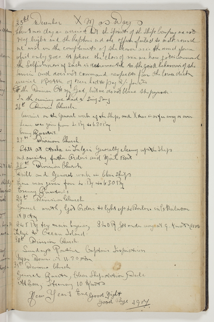 Divisions Church, General Quarters, Clear Ship, Action Drill At Sea, Steaming 10 Knots. New Year's Eve, Good Nigh,t Good Bye 1917.