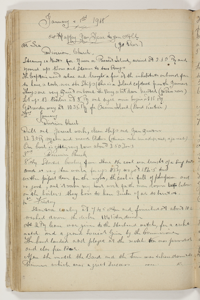 A Happy New Year to you All. At Sea (No Beer). Divisions Church. Steaming 10 Knots for Narru [Nauru] or Pleasant Island, arrived at 3.30 PM and moored up Bow and Stearn to two Bouys. The Captsin went ashore and brought a few of the inhabitants onboard for to have a look over the Ship (this is an Island captured from the Germans.) Things are very Quiet on board the Boy a bit down hearted (No Press news). Lit up B Boilers at 8 PM and tryed main Engine at 10 PM. Got under way at 10.35 PM. (Band Practice)