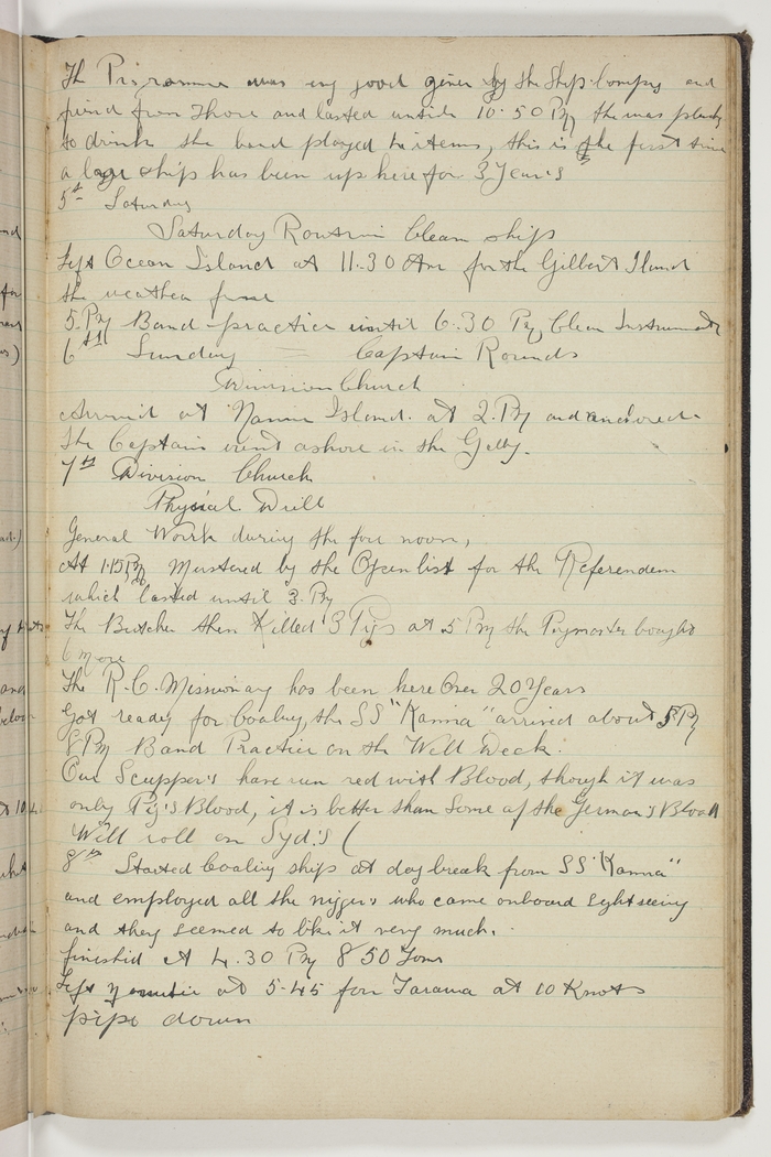 Divisions Church. Physical Drill. General work during the fore noon. At 1.15 P. Mustered by the Open list for the Referendem which lasted until 3 PM. The Butcher then killed 3 Pigs. At 5 PM the Paymaster bought 6 more. The R.C. Missionary has been here over 20 Years. Got ready for Coaling, the SS. "Kanna" arrived about 5 PM. 8 PM Band Practice on the Well Deck. Our Scupper's have run red with Blood, though it was only Pig's Blood, it is better than Some of the German's Blood. Well roll on Sydney.