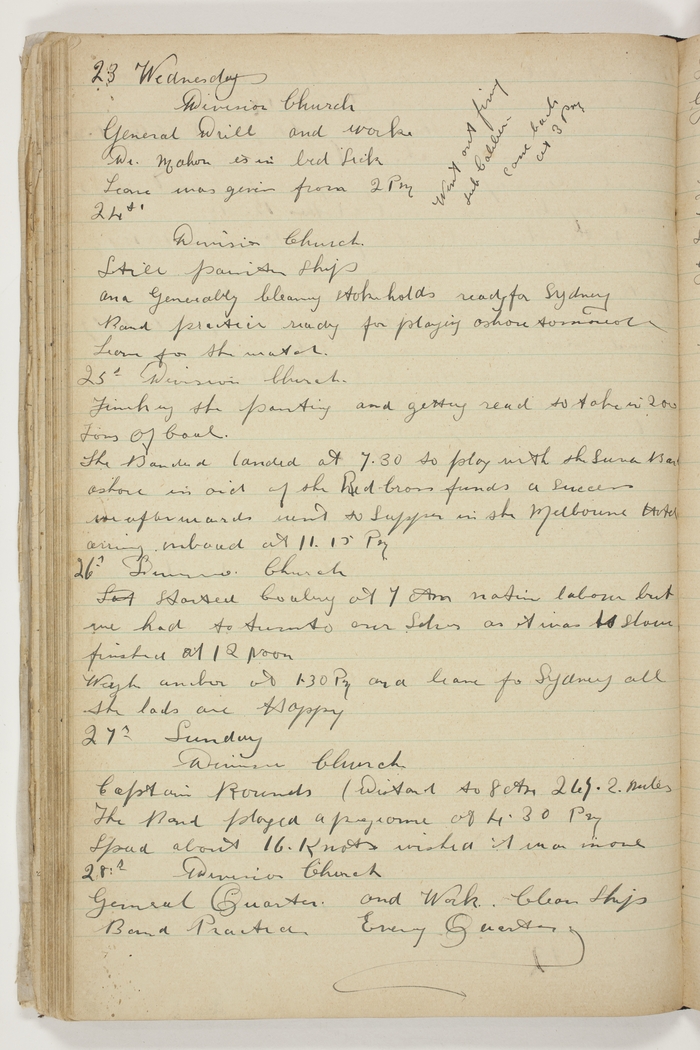 Division Church. Captain Rounds. (Distance to 8 AM. 267.2 Miles.) The Band played a programme at 4.30 PM. Speed about 16 Knots wished it was more.