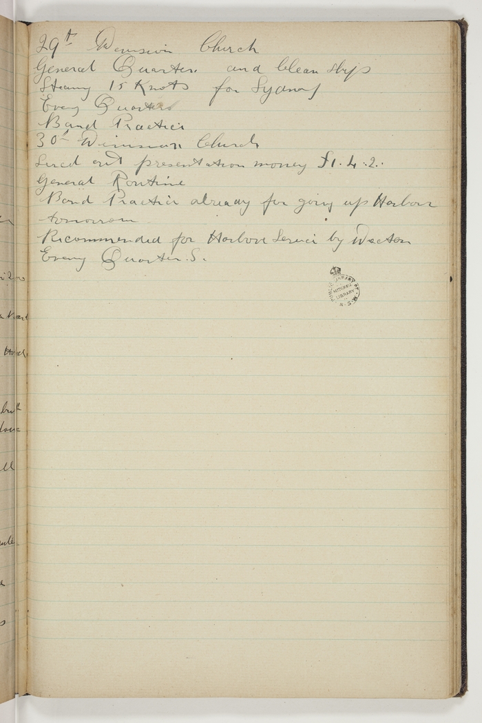 Divisions Church, General Quarters and Clean Ship. Steaming 15 Knots for Sydney. Evening Quarters, Band Practice.