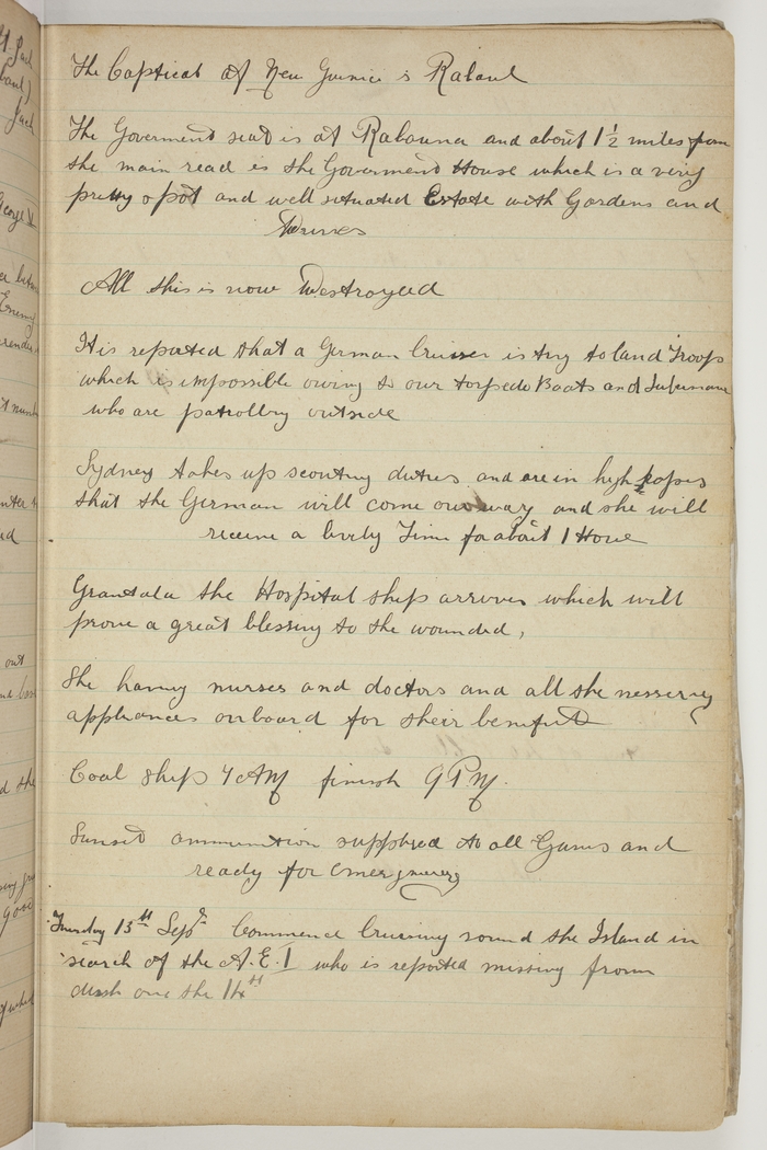 The Captical [capital] of New Guinea is Rabaul. The Government seat is at Ralauna and about 1½ miles from the main road is the Government House which is a very pretty spot and well situated Estate with Gardens and Drives. All this is now Destroyed. It is reported that a German Cruiser is try to land Troops which is impossible owing to our torpedo Boats and Submarines who are patrolling outside. Sydney takes up scouting duties and is in high hopes that the German will come our way and she will receive a lively Time for about 1 Hour. Grantala the Hospital ship arrives which will prove a great blessing to the wounded. She having nurses and doctors and all the necessary appliances on board for their benefit. Coal Ship 7 AM. finish 9 PM. Sunset. Ammunition supplied to all Guns and ready for emergency.